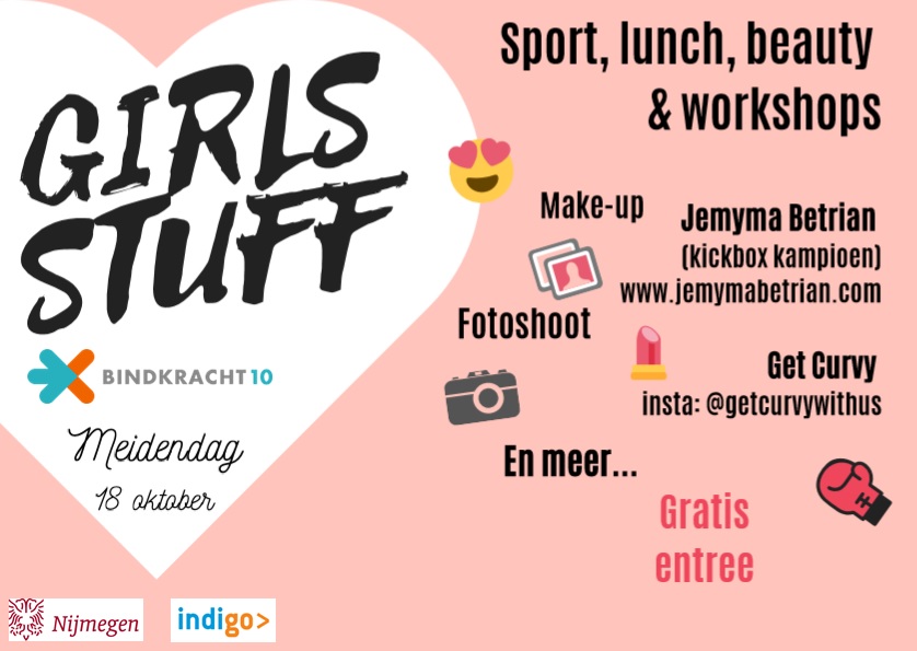 Het jongerenwerk van Bindkracht10 organiseert voor de tweede keer een stedelijke ‘Girls stuff’-middag. Op vrijdag 18 oktober komen ongeveer 90 Nijmeegse meiden in de leeftijd van 10-14 jr bij elkaar voor allerlei workshops rondom de thema’s (online en offline) zelfbeeld en weerbaarheid. Zo geeft de succesvolle WK-finalist boksen Jemyma Betrian een weerbaarheidclinic, vertellen de Nijmeegse vlogsters van Get Curvy hun verhaal en geeft hulpverleningsinstantie Indigo voorlichting over (online) zelfbeeld. Ook zijn er deze middag ervaringsdeskundigen aanwezig en is er een professionele fotograaf, die tips geeft over online presentatie. ‘Girls Stuff’ duurt van 11.00 uur tot 16.15 uur en vindt plaatst op de hoofdlocatie van Bindkracht10 op De Ruyterstraat 244.